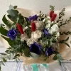 анемон синий - 5шт, гвоздика Брют геофлора - 5шт, листья Озотамнус - 3шт, маттиола (левкой) белая - 1шт, листья эвкалипт гунни - 3шт, листья эвкалипт циннерея - 3шт, листья монстера - 1шт, лагурос колор - 2шт