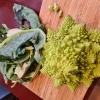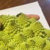 Очень вкусная и красивая капуста, но удовольствие дорогое, потому что половину вилка составляют листья и толстый стебель романеско. На блюде хорошо смотрятся обычная цветная, романеско и брокколи, по вкусу они сильно отличаются, и это интересно.