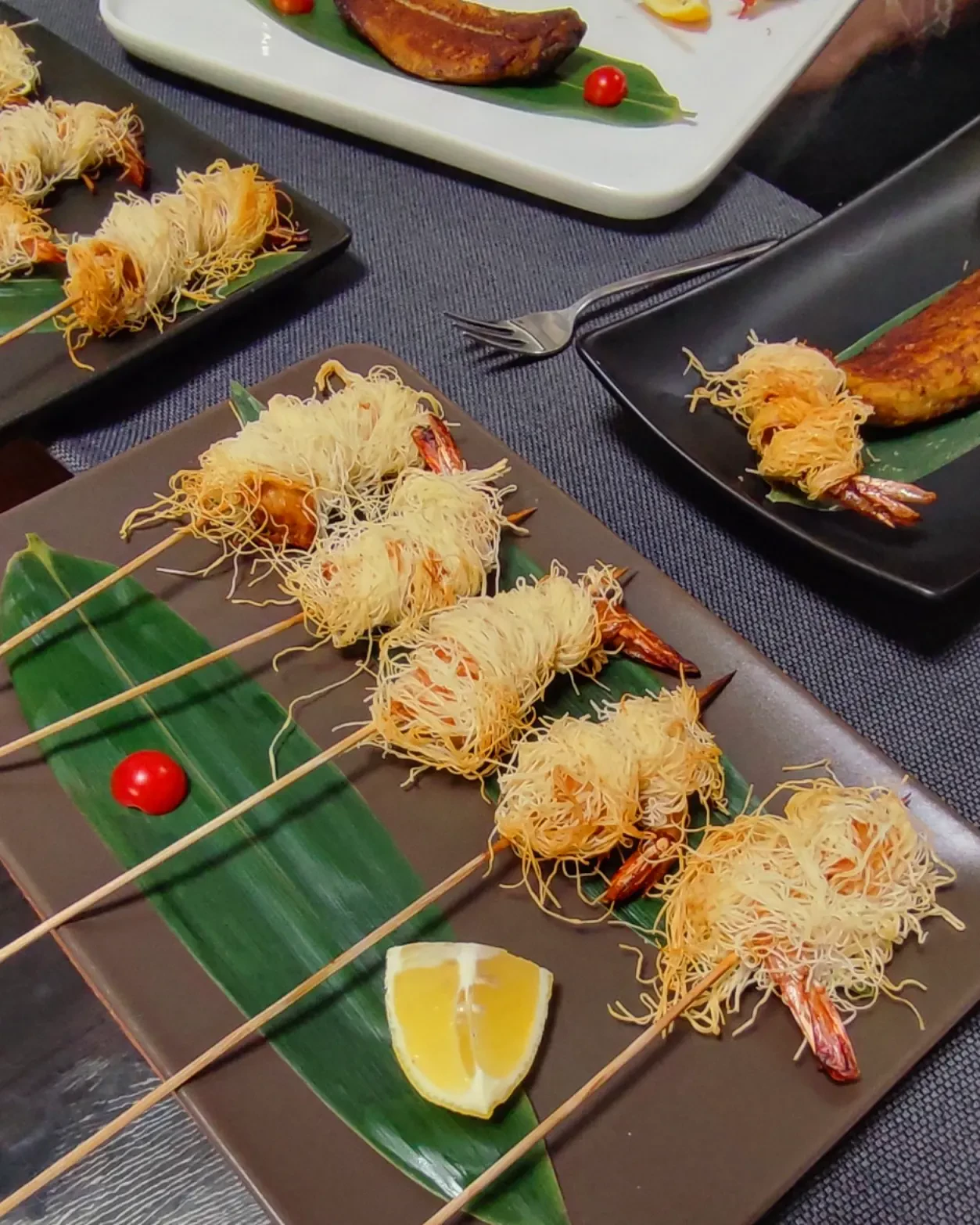 Предлагаем попробовать приготовить лосось в тесте Катаифи. Лосось разделать на филе, снять кожу, удалить кости. Разрезать на одинаковые продольные кусочки, посолить и поперчить, сбрызнуть соком лимона. Отделить нужное количество теста и немного 'разлохматить' его на поверхности. На сковороде разогреть растительное и сливочное масло по 100 грамм каждого вида. Обмотать каждый кусочек рыбки нитями теста и обжарить до золотистого цвета с обеих сторон. Выложить на полотенце.