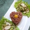 В центре тартара сделать небольшое углубление, выложить желток перепелиного яйца. Украсить салатом из свежих овощей, сбрызнуть заправкой. Подавать с тонкими гренками.